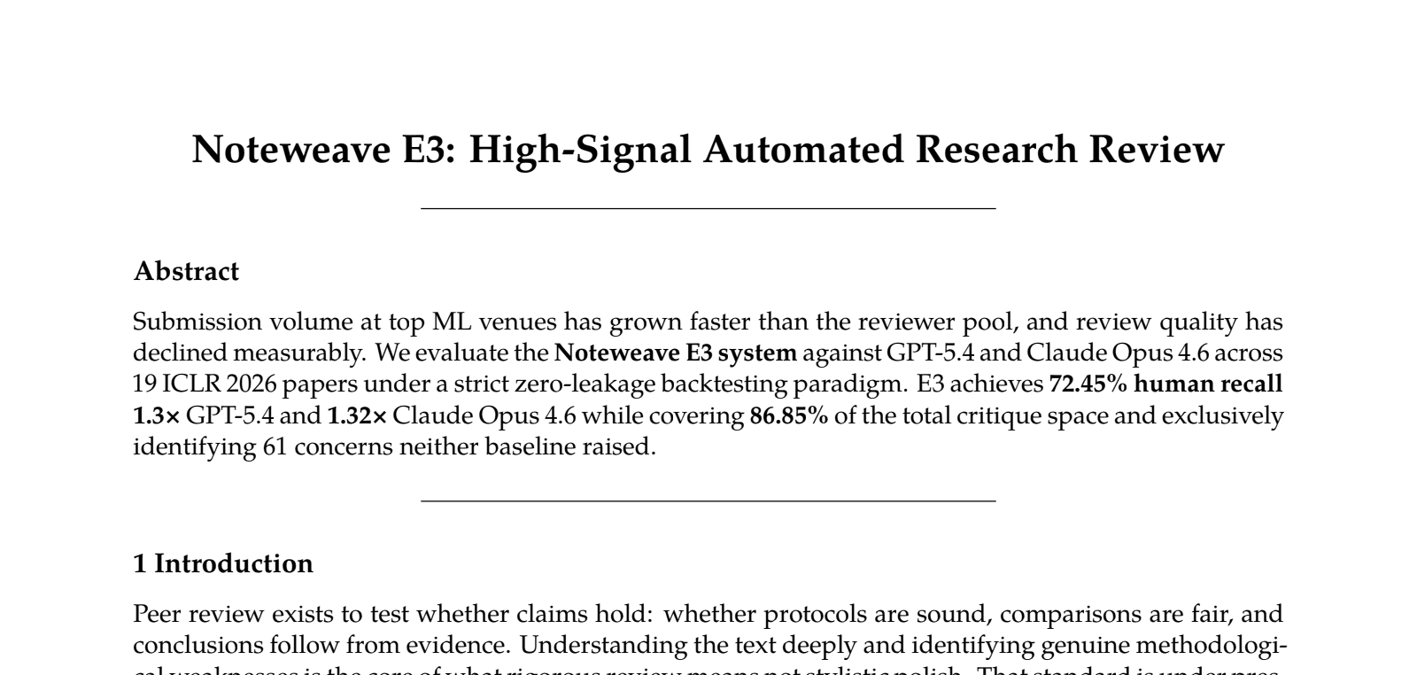 We tested Noteweaves’ E3 system for technical fault finding in academic papers using 19 in the wild(ITW) ICLR 2026 papers. Our system outperformed Claude Opus 4.6 and GPT 5.4 in academic reasoning under the backtesting paradigm — ensuring supremacy in 0 data leakage setups . Link to complete analysis report